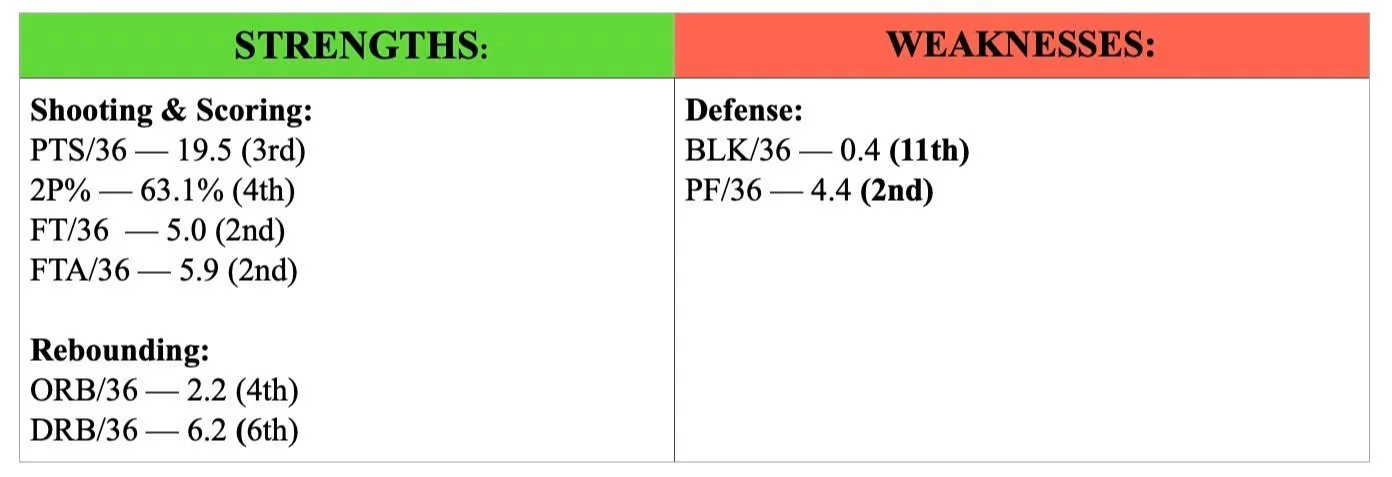 When comparing the PER36 production of these players, Wagner leads with 19.5 PTS/36 while attempting the most FGA/36 (12.9). Though the offensive scheme doesn’t necessarily go through him, it doesn’t steer away from him. Wagner takes 5.3 3PA/36, which is significantly more than his comps (Metu: 2.0, Gafford: 0.0). While Metu and Gafford earn 16.7% and 18.4% of their points from free throws, Wagner earns 25.6%, demonstrating the ability to draw fouls and convert easy points.